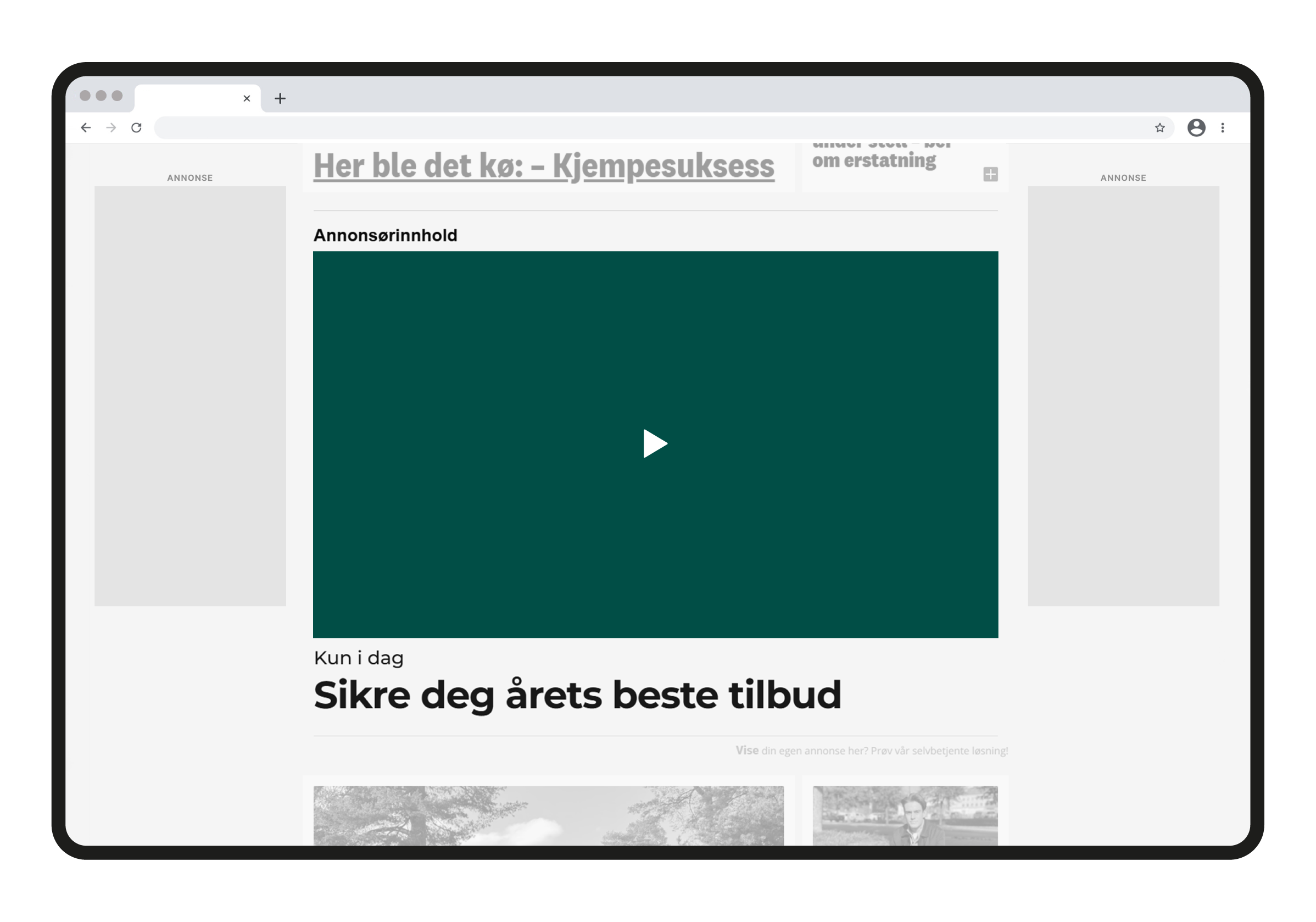 Mal for Video Native i banner er tilpasset avisenes redaksjonelle uttrykk og design, men det er tydelig merket med “Annonsørinnhold” øverst til venstre. Vi anbefaler å ha en liten logo som vil ligge oppe til høyre.